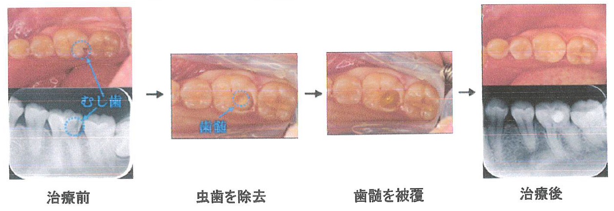 歯髄が虫歯や外傷などにより露出してしまう場合に、その歯髄を可能な限り保存し、 歯の健康を保ち、その歯の寿命をより長くする治療法です。